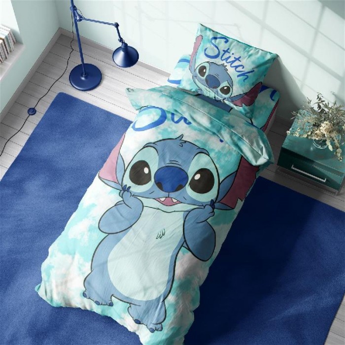 Παιδικό σετ σεντόνια 4 τεμαχίων που περιέχει: 2τεμ. flat σεντόνια, διαστάσεων 160X240 cm και 2τεμ. μαξιλαροθήκες διαστάσεων, 50X70 cm. Κατασκευασμένο από 100% βαμβακερό ύφασμα, με σχέδιο ψηφιακής εκτύπωσης που απεικονίζει τον Stitch, τον αγαπημένο ήρωα της σειράς της Disney, Lilo & Stitch, 144 κλωστών. Συσκευασία δίπτυχο PVC bag.