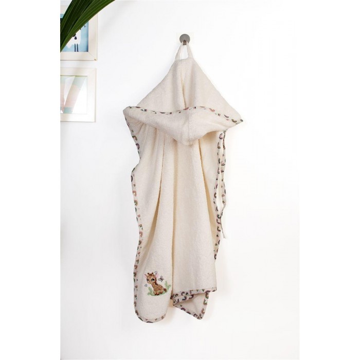 Βρεφική κάπα χρώματος εκρού διαστάσεων 75 x 85 cm, διακοσμημένη με χαριτωμένο κέντημα καμηλοπάρδαλη και χρωματιστό ρέλι με μοτίβο ουράνια τόξα. Κατασκευασμένη από 100% βαμβακερή υποαλλεργική πετσέτα υψηλής απορροφητικότητας, βάρους 400 gr/m² ελεγμένη για επιβλαβείς ουσίες με το παγκοσμίως αναγνωρισμένο πιστοποιητικό, OEKO TEX® Standard 100. Η απαλή υφή της προσφέρει την ιδανική φροντίδα, ενώ η ενσωματωμένη κουκούλα κρατάει το κεφαλάκι του μωρού ζεστό. Συσκευασία δώρου: κουτί πολυτελείας.